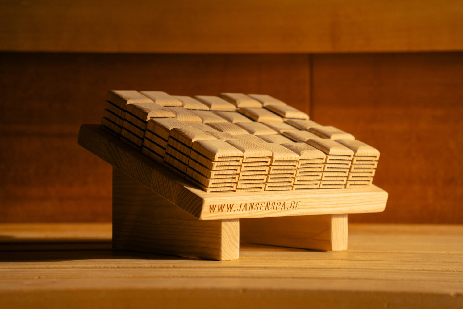 Entdecke unser patentiertes Saunakissen aus 100% Holz. Die Federn sind aus Eschenholz handgefertigt und unterstützen deinen Kopf und Nacken ergonomisch. Nur hier erhältlich.